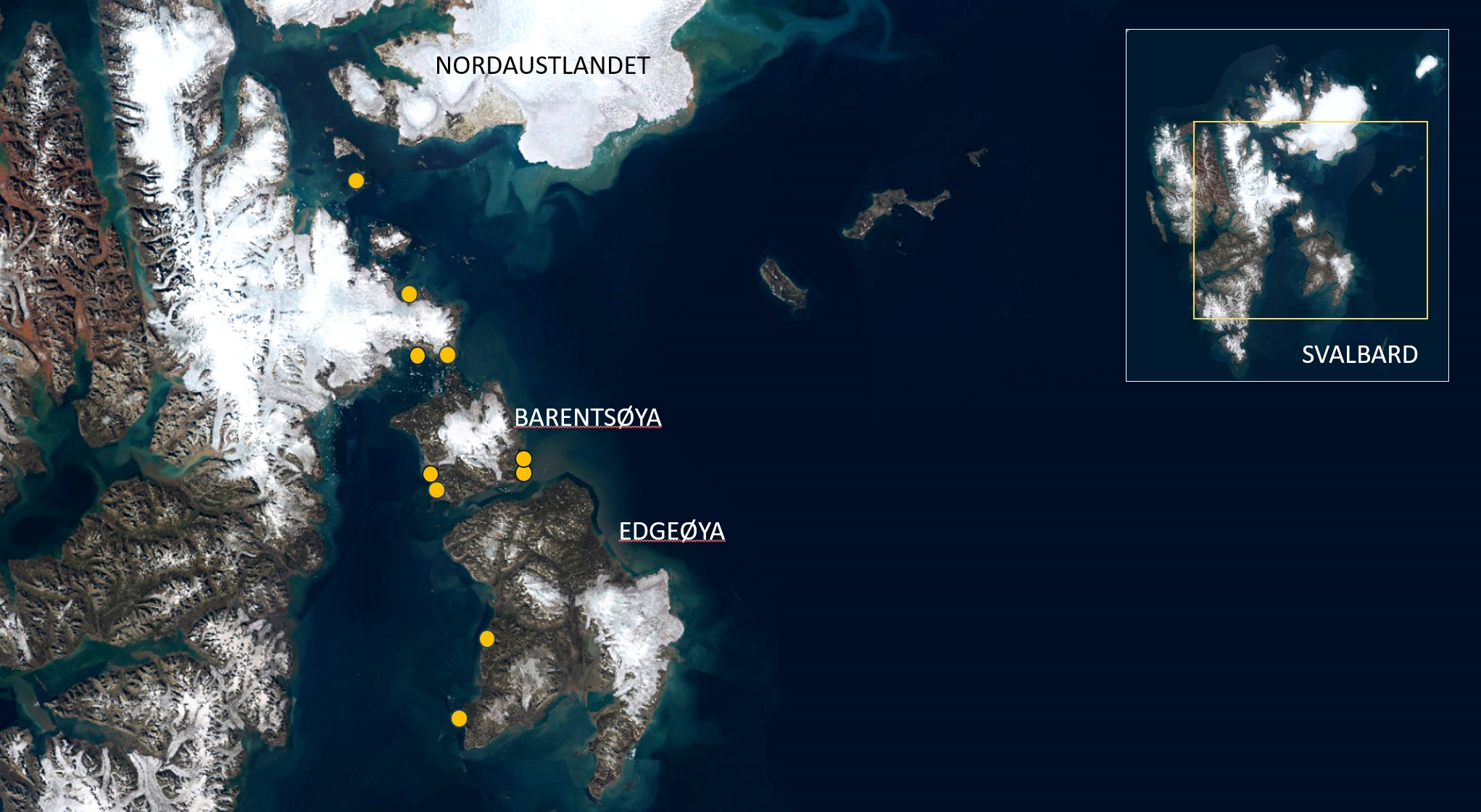 Miejsca lądowań wyprawy w rejonie wschodniego Spitsbergenu, Edgeøya, Barentsøya (mapa satelitarna – serwis TOPOSVALBARD).
