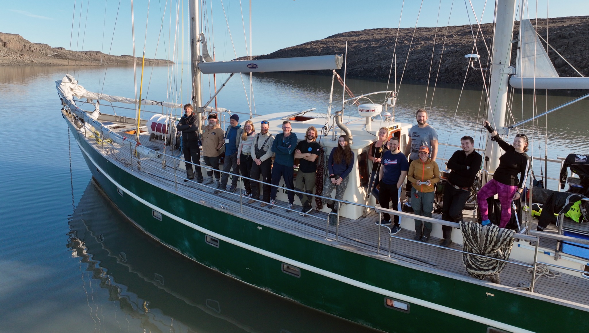 28 sierpień 2024. Wschodni Svalbard, Heleysundet. Członkowie wyprawy na pokładzie jachtu S/Y Ocean A (NATANGO). Od Lewej stoją: Krzysztof Michalski (kierownik wyprawy, IGF PAN), Daniel Dunkley (IGF PAN), Wiesław Ziaja (UJ), Anna Sartell (UNIS), Kim Senger (UNIS), Tomasz Karasiewicz (UMK Toruń), Maciej Chełchowski (IO PAN), Lena Szczepanek (deckhand), Alicja Latoń (I oficer), Artur Trzebny (UAM Poznań), Paweł Pelc (kapitan rejsu), Tereza Mosociova (Uniwersytet w Oslo), Szczepan Bal (IGF PAN), Izabela Look (cook). Fot. zdjęcie wykonane za pomocą drona Mavic 3 Pro przez Terezę Mosociovą; VR Svalbard, Svalbox.