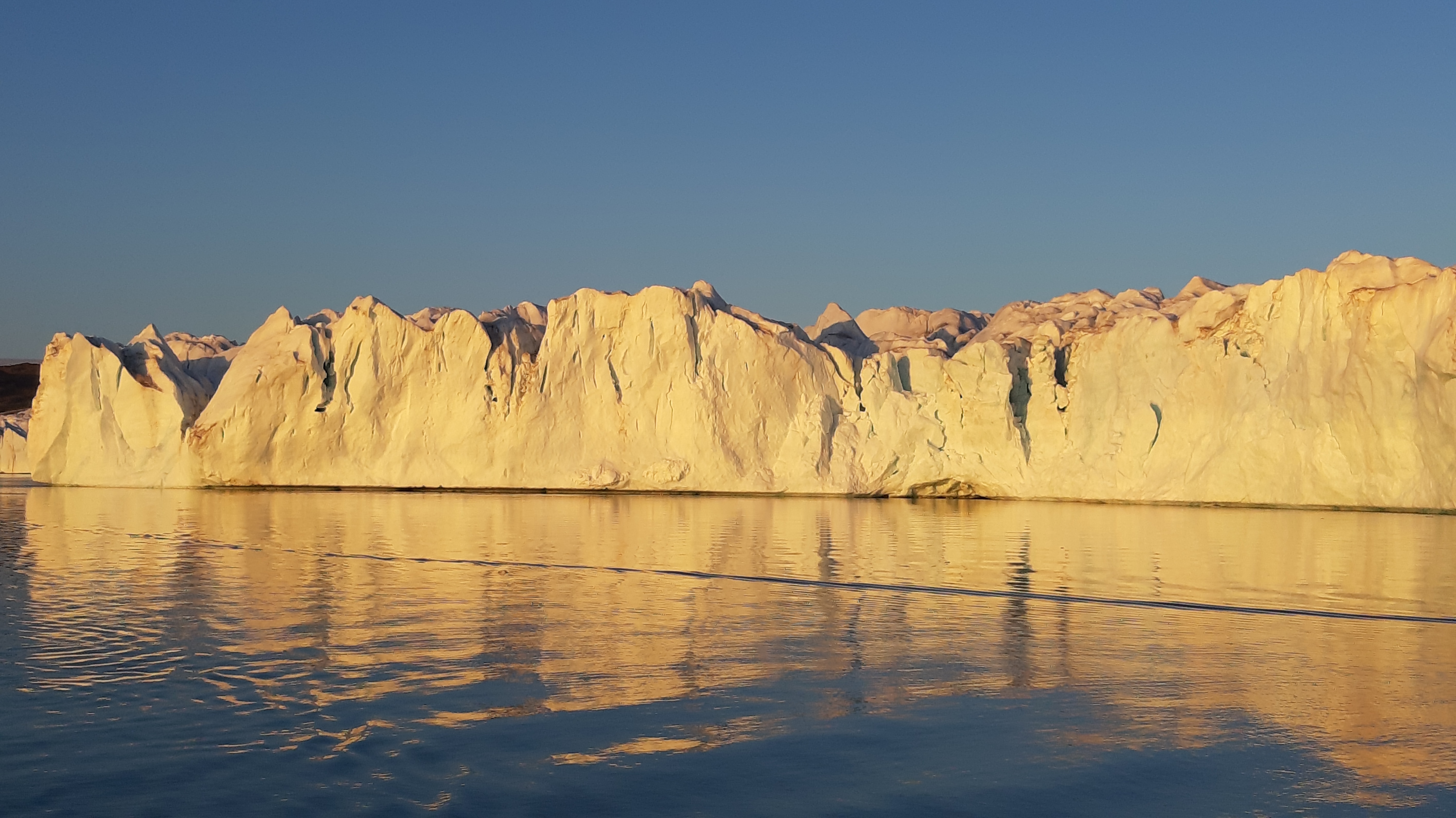 Lodowiec schodzący do morza na północno-zachodnim wybrzeżu Nordaustlandet, oświetlany przez promienie późnoletniego słońca.