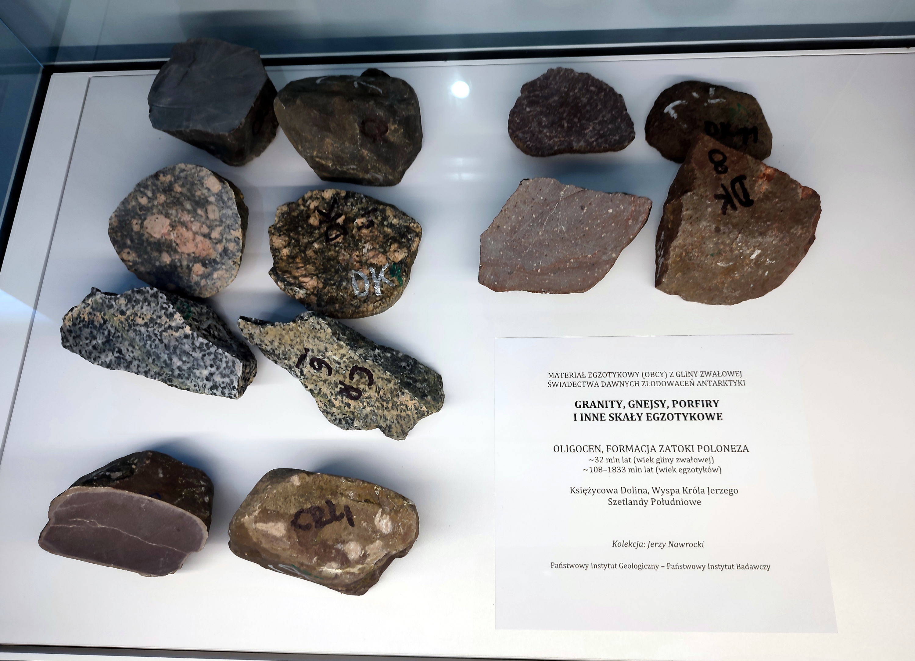 Kolekcja skał egzotykowych z Wyspy Króla Jerzego (Szetlandy Południowe, Antarktyka Zachodnia) eksponowana podczas wystawy. Fot. M. Korczak-Abshire.
