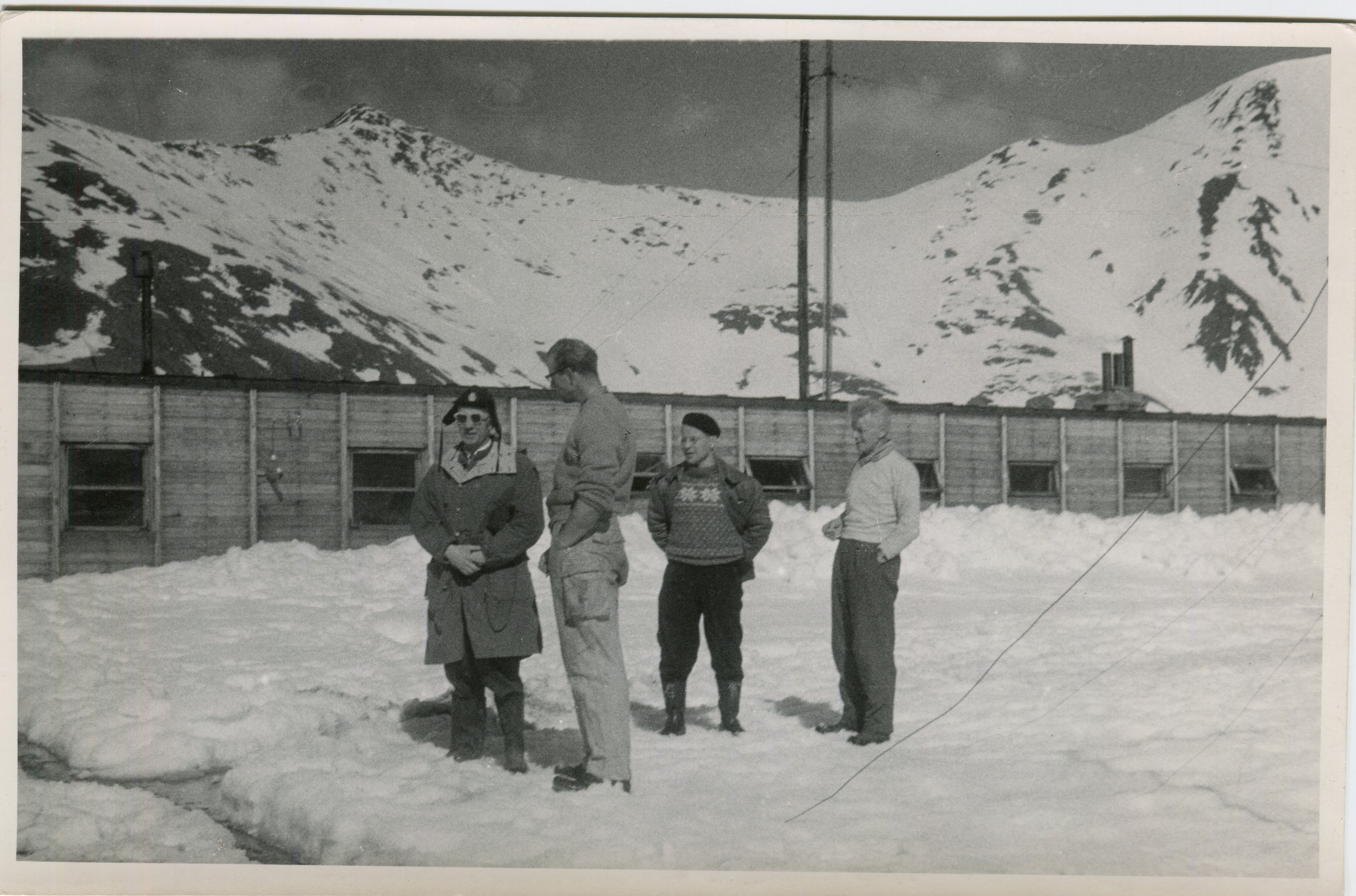 Przed budynkiem Polskiej Stacji Polarnej Hornsund w Isbjørnhamna, stoją od lewej: Gubernator Svalbardu – Odd Birketvedt, norweski polarnik Lars Fasting, ambasador Polski w Norwegii –